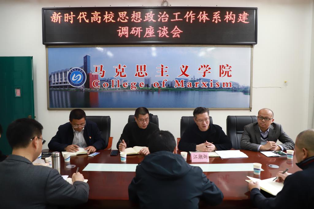 3月17日上午,校党委副书记江潮炳莅临英国365(集团)公司官方网站开展“新时代高校思想政治工作体系构建”专题调研。校党委宣传部长高春晗,学工部(处)副部(处)长郑常鳜,党委组织部组织科涂双斌,宣传部文明建设科陈丹丹,英国365(集团)公司官方网站党政领导、党委组织员、辅导员等参加调研座谈会。