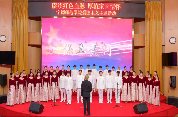 “风在吼,马在叫,黄河在咆哮!”教育学院音乐学专业学生在林东波教授的指挥下唱响《保卫黄河》,多声部轮唱、各声部交替推进如黄河奔涌,全场师生不约而同加入合唱,激昂的旋律在报告厅内回荡,唱出了中华儿女在中国共产党的领导下拯救民族危亡的时代强音,唱出了宁师学子对抗战英雄的致敬、对历史的铭记,更唱响了新时代青年的热血担当。
