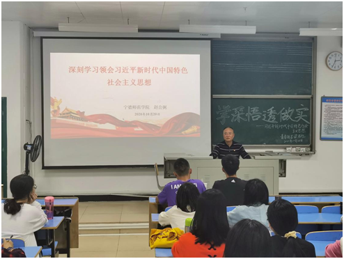 “在座的54位同学,大家都要有光荣感、责任感、使命感。光荣总是与责任联系在一起的,要负起责任,理论水平首先就要有很大的提升!我们主要是马克思主义理论,习近平新时代中国特色社会主义思想是当代马克思主义中国化的最新理论成果。”赵公弼老师慷慨激昂地向同学们阐述习近平新时代中国特色社会主义思想、怎么去学习和学习一篇习近平总书记最新讲话三方面来阐述如何在理论上学深悟透,实践上如何做实的问题,以期同学们最后可以做到真学、真信、真懂和真用马克思主义。