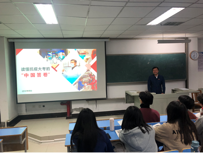 颜副校长语言简洁凝练,亲切随和,解读深入浅出,辅之以丰富而有代表性的抗疫视频及图片,并结合我校抗疫的具体做法和他自己的亲身体会,给同学们呈现了一堂生动而感人的思政课。同学们上完课后纷纷表示,这堂课又激起了他们刚刚沉静下来的关于中国抗疫的内心感悟,为身为中国人而感到骄傲,祝福伟大的祖国永远康健!