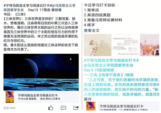 笔记大赛活动中,同学们的笔记或字迹优美、或条理清晰、或内容详尽、或图文并茂,各有所长,字里行间无一不展现了马院学子刻苦勤奋的学习态度和精益求精的精神风貌。“读书打卡活动”自4月23日至5月7日为期15天,采用“线上打卡”的新颖形式,以“宅家不释卷,抗疫共读书”为主题,通过QQ空间平台打卡。马院学子在完成课堂教学之余,按时按规完成打卡任务,同学们之间互相分享阅读内容、时政热点、每日学习、好句分享等综合知识,传递知识,快乐阅读。劳动实践活动同样采用线上形式,利用微博分享同学们宅家期间社区志愿服务、农业生产劳动、家庭日常劳动的照片,让劳动实践的乐趣和与家人相处的幸福在院内与其他同学分享,充分展现了马院学子的劳动实践能力。随着同学们自主学习习惯的逐步养成,通过学习过程中的逐步积累,感悟与思考也更加深入。丰富了教学质量月系列活动,丰富了同学们的业余生活,提升了同学们的身心全面健康成长。