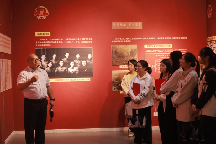 首先,福建省闽东畲族博物馆(宁德市博物馆)馆长雷志华带领师生参观“闽东人民抗日战争史迹”专题展览并进行现场讲解。雷志华馆长通过丰富的历史照片、文献资料和战斗序列图,以闽东子弟兵为骨干的新四军第三支队第六团的抗日战斗历程,通过时间脉络生动讲解了闽东儿女在中国人民抗日战争中的作出的突出贡献及英雄事迹。