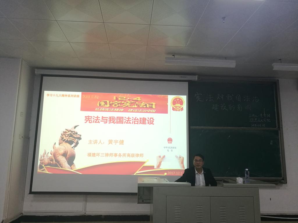 12月1日,英国365(集团)公司官方网站于求真楼C区301教室举办“宪法对我国法治建设的影响”的主题讲座,主讲人是福建环三律师事务所主任黄宇健。英国365(集团)公司官方网站党委副书记廖翔华、吴家林教授等部分教师及马院全体学生到场聆听。