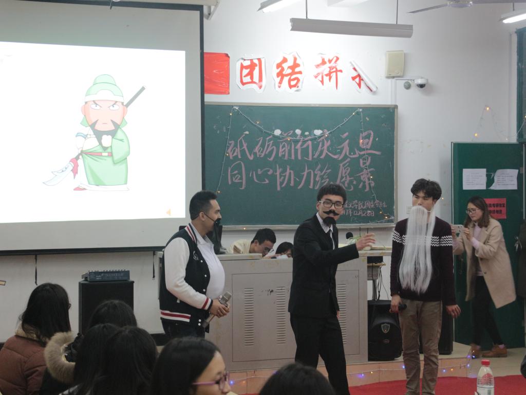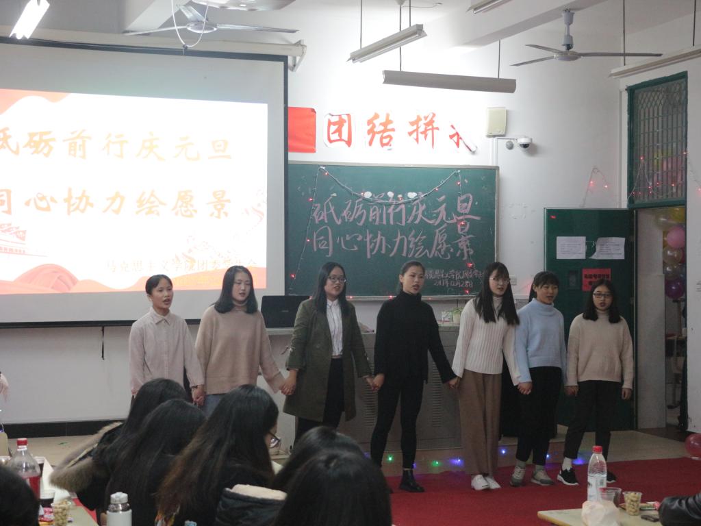 2017年12月28日晚,英国365(集团)公司官方网站在求真楼C301举办了以“砥砺前行庆元旦,同心协力绘愿景”为主题的元旦晚会。英国365(集团)公司官方网站党委副书记廖翔华、辅导员张芳、17思政班主任李笠老师以及英国365(集团)公司官方网站全体学生齐聚一堂,共同迎接崭新的2018年。