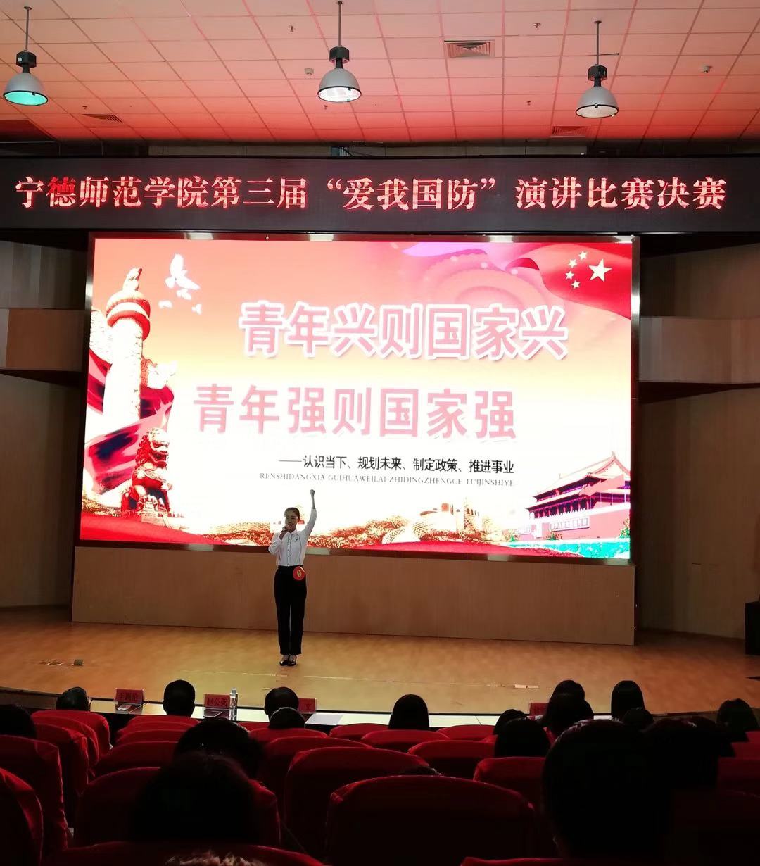 我院三组选手围绕“爱我国防”这一主题,用一个个鲜活的故事,表达了国防的重要性,赞颂了国防和军队现代化建设的辉煌成就。“中国公民,当你在海外遭遇危险,不要放弃,请你记住,在你身后有一个强大的祖国。”来自我院的张敏轩演讲《强我国防,壮我国威》时,通过引用影片《战狼2》中护照上的这句话,融合PPT一幅幅生动的画面,展示我国军队荣光和国家富强。用朴实而富有激情的演讲讴歌了党领导下的军人的家国情怀,表达了大学生的民族自豪感和历史使命感。“国家的需要,永远是我奔走的方向”朱枫和卓柔茜以搭档合作的形式演讲《国防之光,由我们守护》,时而激昂高亢,时而低沉颂吟,真切地表达了自己对“爱我国防”的理解。缪婉婷的《国防在我心中》通过鲜明的对比,得出青年一代要勇做时代的弄潮儿,令在场的观众感动不已。