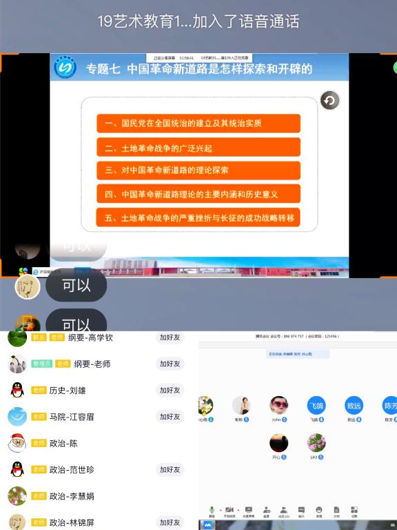 高学钦老师于4月20日3、4节开展了一次《近现代史纲要》的公开课。高老师也是用QQ群分享屏幕的方式开展教学,他讲课的主题是:中国革命新道路是怎样探索和开辟的,从国民党统治的实质到土地革命战争的广泛开展,他用许多历史故事与历史的案例深入浅出的带领同学们了解这一时期的历史,学生分别在QQ群里给予回应,互动良好。晚上七点半,召开腾讯视频评课会议,这次评课与政教专业的林锦屏老师与彬彬老师的公开课合在一起