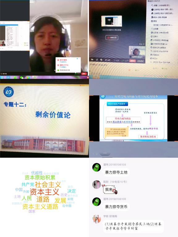 黄玉桃老师于4月14日(周二)3、4节率先在18级《马克思主义基本原理概论》课上了一次公开课,她用QQ群进行分享屏幕教学,并配套使用学习通的互动功能,从签到、选人、课堂讨论、学生连线等互动方式对马克思剩余价值理论进行了层次递进的分析与阐述。学生互动积极,讨论热烈。十多位思政教师参与了课堂活动。下午3点,由黄玉桃老师发起腾讯视频会议,组织老师进行线上评课活动,针对线上如何更好的加强师生互动展开讨论,并对公开课存在的不足提出建议。