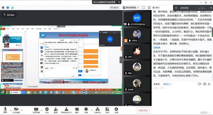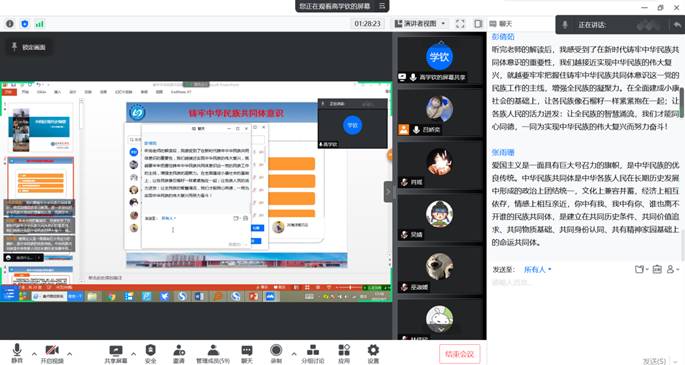 化学与材料学院的刘慧楠同学结合高学钦副教授对中华民族共同体意识产生历史的讲解分享道:“党的民族工作要始终坚持党的领导不动摇,促进各民族交往交流交融,与各民族一同走上‘全面建设社会主义现代化,一个民族也不能落下’的新征程。团结就是力量,团结才能胜利。面对新冠肺炎疫情这一大考,只有各民族兄弟姐妹同呼吸、共命运,肩并肩、心连心,才能取得抗疫斗争的全面胜利。”