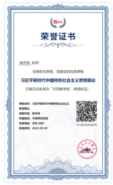 陈开梓老师建设的这门线上课程,以授课内容新颖、制作水平精良、教学资料丰富、结构完整突出等特色,并结合宁德作为习近平新时代中国特色社会主义思想的孕育地、实践地的独特地方思政资源优势,已打造成具有一定地方特色的优质线上课程。