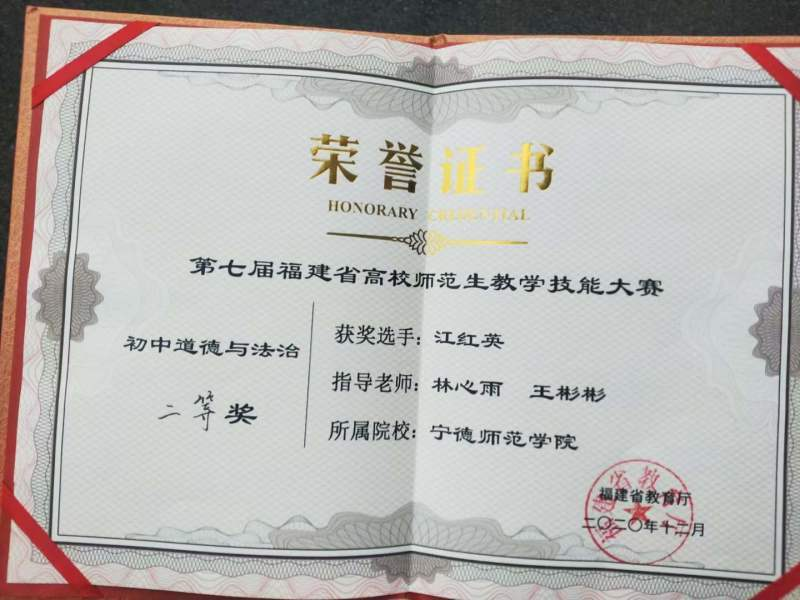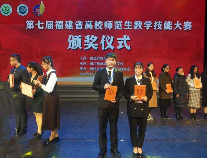 为贯彻落实《中共中央国务院关于全面深化新时代教师队伍建设改革的意见》和全国全省高校毕业生就业创业工作视频会议精神,进一步提高我省高校师范专业毕业生教学技能水平和就业竞争力,近日,由福建省教育厅主办的“福建省第七届高校师范生教学技能大赛”在闽江师范高等专科学校落下帷幕。我院的杨涛、江红英两位同学积极备赛,并在江容眉、林心雨、林明华、王彬彬四位优秀老师的指导下,杨涛同学斩获初中道德与法治组一等奖,江红英同学斩获初中道德与法治组二等奖。