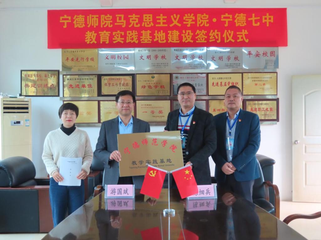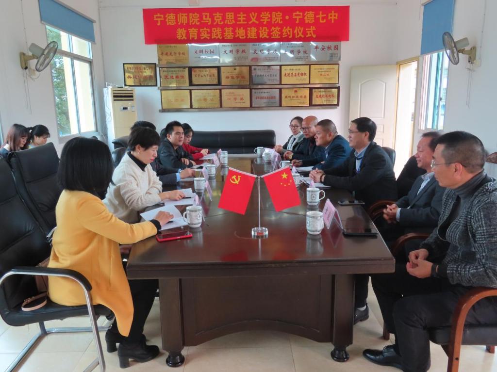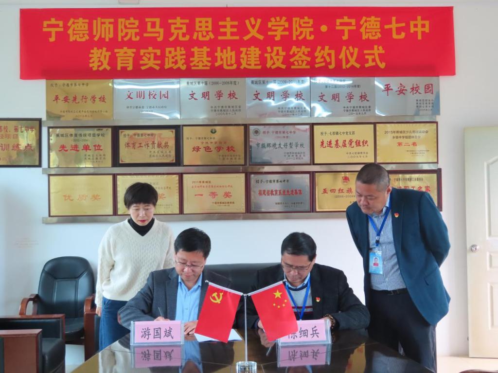 为加强高校与中学之间的良性互动交流,加强实践育人、教育育人,12月11日,英国365(集团)公司官方网站与宁德七中举行共建教学实践基地签约仪式。宁德师院英国365(集团)公司官方网站院长游国斌、副教授林锦屏、教科办陈芳,宁德七中校长陈细兵及校领导班子成员、思政课教师代表游蔚燕及我院实习生出席仪式。