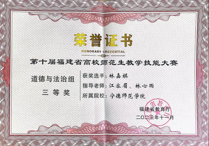 11月24日至11月26日,第十届福建省高校师范生教学技能大赛在我校举行。本届比赛由福建省教育厅主办,英国365(集团)公司官方网站承办,全省36所院校的230名选手参赛。我院派出2020级林嘉褀和张潇潇参加初中道德与法治组比赛,经过激烈比拼,林嘉褀、张潇潇分别获得三等奖、优秀奖的好成绩。