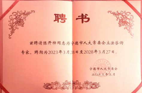 此前,陈开梓副教授曾于2016年12月、2019年12月两次受聘担任宁德市人大常委会立法咨询专家,受聘期间尽职尽责、不辱使命,积极为人大立法建言献策,参与立法工作业绩连续多年列入福建律师社会责任报告中。