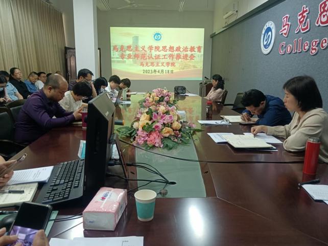 2023年4月18日下午,英国365(集团)公司官方网站在求知楼D302召开思政专业师范认证工作推进会,会议由黄玉桃副院长主持,全院教师参加。首先,黄玉桃副院长对当前思政专业师范认证的工作进行梳理,要求师范认证八个一级指标的组长要明确职责,针对自评报告专家反馈的问题要逐字逐句进行解读,并积极组织小组成员及时修改,重新校对自评报告,为下一步校外专家评阅做好充分准备;6门专业核心课程的思政课教师要及时完善课程目标达成度分析,丰富过程性评价内容,不断充实课程材料。其次,各组组长及思政专业课教师就目前工作推进中遇到的问题进行积极反馈,共同探讨解决方案。最后,党委书记吴立志强调全院教师要高度重视师范专业认证工作,将其作为当前工作的重中之重,要不断加强师范认证的专业知识学习,以饱满的精神状态积极投入到师范认证工作中,举全院之力,确保认证工作顺利通过。