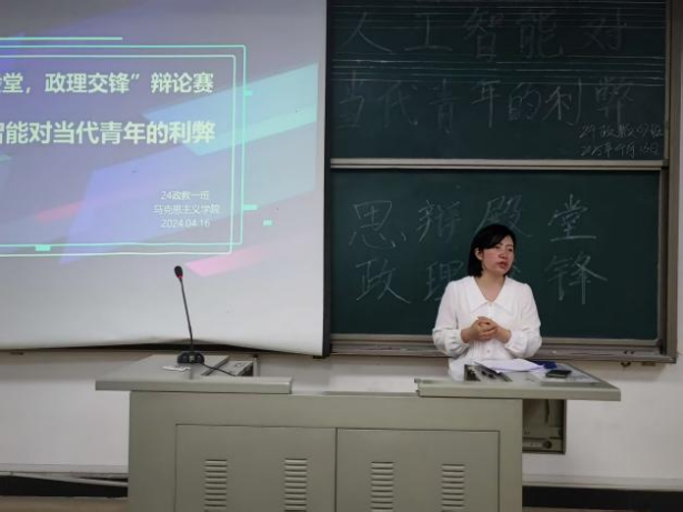 为了培养我院24级学生在马克思主义哲学课堂上的思辨性思维,锻炼其表达能力,促进专业知识的理解与应用,同时增强学生的凝聚力,4月16日下午,我院24级学生于AB201马克思主义哲学课堂上顺利开展了一场以“人工智能对当代青年的利弊”为主题的辩论赛。本次辩论赛在我院马克思主义哲学课授课教师黄玉桃指导下顺利举办,24级政教1班全体同学积极参与。
